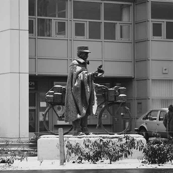 Das Thema «Versetzung» treibt den Flaneur stante pede um die Ecke Bahnhof-KKL zur Universität, genauer sagt: zur Frohburgstrasse 3. Hier steht das meistgefährdete öffentliche Kunstwerk in der Stadt – offenbar herrenloses Gut. Kunsträuber hätten leichtes Spiel; ein Camion mit Hebebühne oder kleinem Kran genügten für die Entführung der Bronzefigur «Der Pöstler» von Rolf Brem. Der Briefträger steht neben dem Velo, dessen zwei Gepäckträger sind voll beladen, er schaut auf die Briefpost in der Hand. Die Figur im Kaputt, mit Mütze und Schnauz, sieht wie ein junger General Guisan aus.
