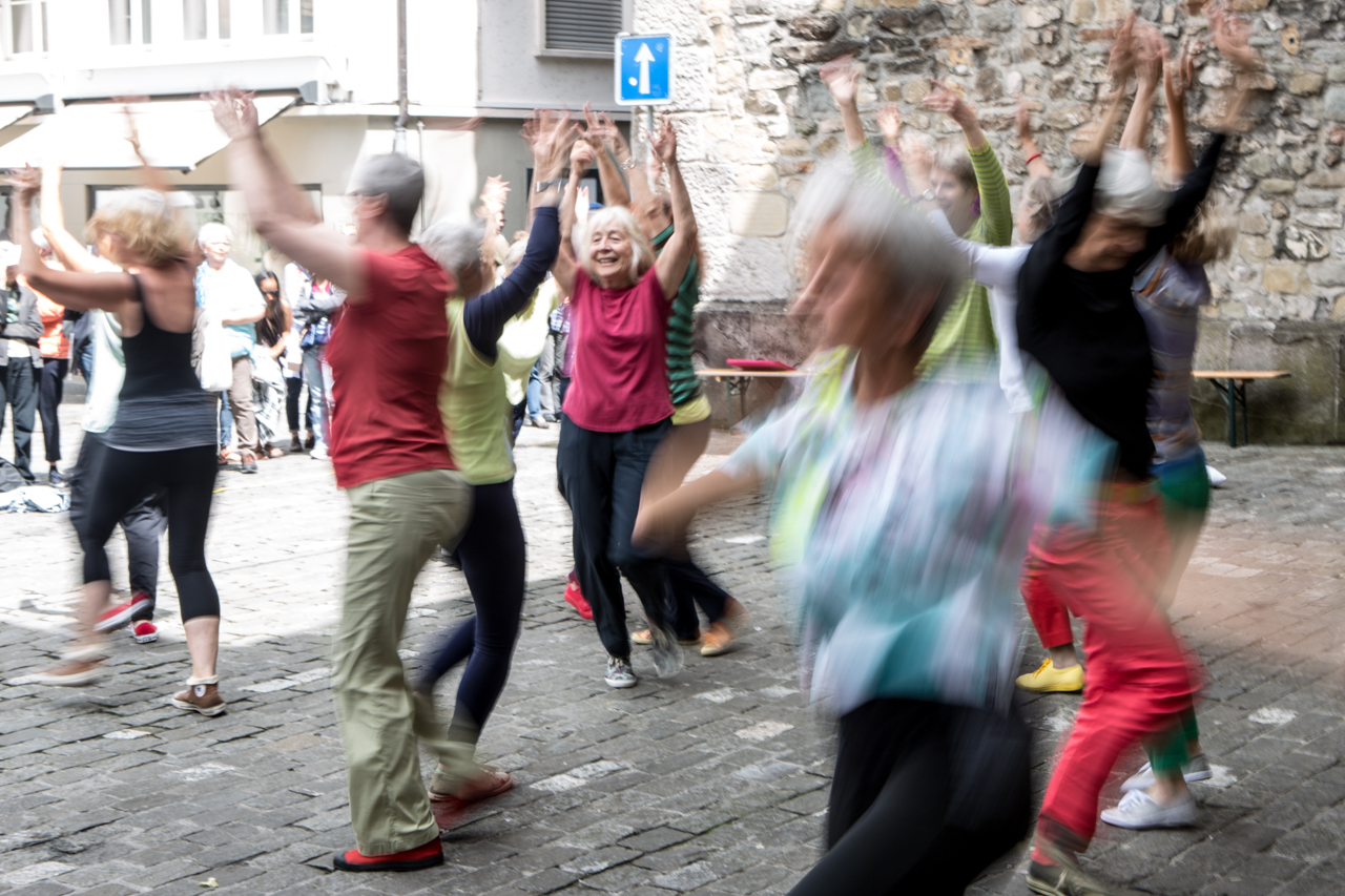 „Alter bewegt“ Das diesjährige Motto wurde im Lauf des Rahmenprogramms auf unterschiedlichste Art interpretiert. Am anschaulichsten dargestellt haben es rund 20 Frauen, die mit ihrer Performance auf dem Kornmarkt an diesem Tag vier Mal ein bunt gemischtes Publikum fanden. Da sassen sie zu Beginn in Bademänteln auf den Steinbänken entlang der Rathausmauer, in sich gekehrt und stumm. Meine spontane Deutung: depressive Bewohnerinnen eines Pflegeheims, die warten bis der Tag um ist. Doch dann ein paar Musikklänge, ein Kopf der sich hebt, ein Körper, der sich streckt, die erste Frau, die aufrecht auf den Platz marschiert, ihren Bademantel wegwirft und in bunter Alltagskleidung gekonnte Tanzsprünge aufs Kopfsteinpflaster legt. Bis es ihr nach und nach die ganze Gruppe gleichtut. Oh, erkannte ich da, Musik und Bewegung erweckt diese Alten sozusagen zu neuem Leben! Das Publikum spendete begeistert Beifall. Einstudiert in nicht mehr als acht Proben hat die choreographische Darbietung "Mer gönd!" der Tanzpädagoge Kurt Dreyer (zum Porträt).