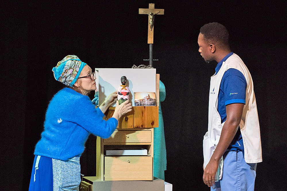 Sadio Cissokho legt nach dem leisen Spiel neben der Bühne seine Kora beiseite, schlingt die Gebetsschnur um die Hand, zieht die Spitexschürze über, kontaktiert den Laptop und meldet sich bei Frau Schneebeli. Diese erschrickt, als anstelle von Frau Fröhlich ein fremd aussehender Mann vor der Türe steht. Sie will wissen, woher er ursprünglich und ur-ursprünglich kommt und hat Angst, er sei vielleicht ein Terrorist. Der junge Mann erklärt, dass auch er zu Gott betet. Die alte Frau erzählt ihm von Pater Schosef, der in afrikanischen Ländern als Missionar für die «armen Negerlein» gearbeitet hat, was ihn empört. «Wir sind keine armen Negerlein. Wir sind reich, wir besitzen die Weisheit alter Menschen.» Widerwillig lässt sich die alte Frau die Stützstrümpfe anziehen, den Blutdruck messen und die Medikamente verabreichen. Nach seinem Weggang holt sie den Rosenkranz hervor, schwelgt in Erinnerungen an ihre verbotenen Treffen mit dem Pater und lebt dabei sichtlich auf.