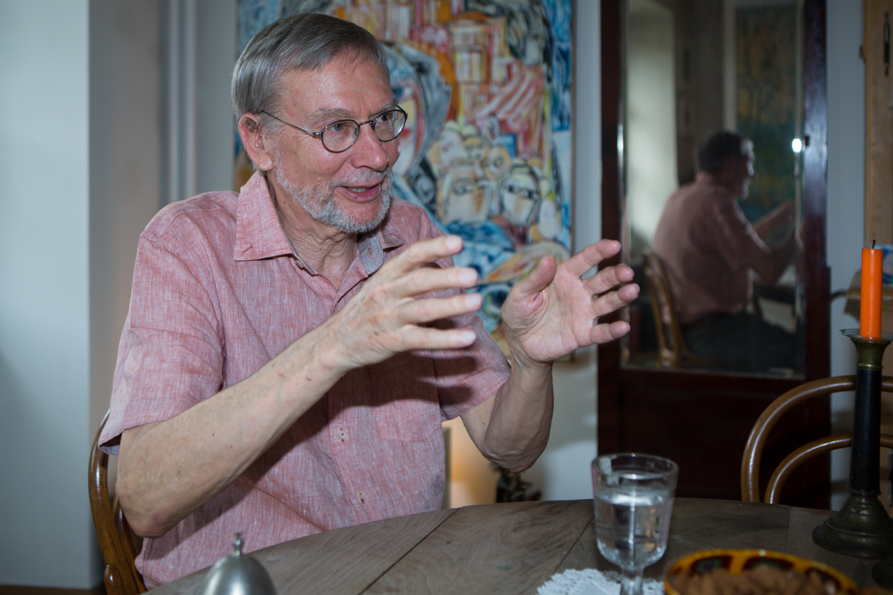 Beni Raeber führt mich noch auf den kleinen Dachgarten. Von der Rigi bis zum Pilatus sieht man die Alpenkette, links das Rathaus mit der Sonnenuhr, die anzeigt, dass am Folgetag Vollmond ist, ennet der Reuss das Theater und die Jesuitenkirche, zu Füssen das Brandgässli. Viel Weitblick über den engen Gassen. Im Treppenhaus hängt ein kleiner Teil des Brief- bzw. Bildwechsels mit dem Grafiker und Illustrator Röbi Wyss. Je über 800 A5 grosse Aquarelle und Collagen haben sich die beiden Freunde während 20 Jahren wöchentlich zugesandt, gezeichnete Geschichten. Überall Bilder: Poliakoff, Dmitrienko, Dahmen, Walker, Egloff, Schärer, Schurtenberger, Schulthess, Suter, Thomkins undsoweiterundsofort, kaum ein Quadratmeter leere Wand. Erinnerungen steigen auch im Besucher auf: ein erster Galeriebesuch anlässlich der Vernissage von Serge Poliakoff 1965 an der Frankenstrasse, mittendrin Beni, schon damals wortgewandt, charmant, wirblig. So ist er immer noch. Ich bin sicher: Im Kopf tummeln sich noch weitere 1000 Bilder und Geschichten. Beni Raeber – buchstäblich ein Tausendsassa.