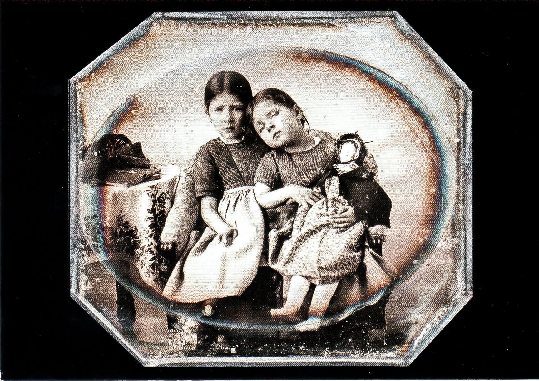 Das eine Bild (oben) wurde um 1845 aufgenommen. Damals waren es immer professionelle Fotografen, die mit Erinnerungsbildern von Hochzeiten, Neugeborenen oder erster Kommunion beauftragt wurden. Die beiden Mädchen sind wahrscheinlich Schwestern. Eines der Mädchen bekam vom Fotografen eine Puppe in den Arm gelegt. Es wird die Jüngere sein, die sich anlehnt. Das Anlehnen soll vielleicht zeigen, dass der älteren Schwester eine beschützende Rolle zukommt. Dieses vertrauensvolle Anlehnen wird mit den geschlossenen Augen des jüngeren Kindes verstärkt. Das ältere Mädchen trägt Verantwortung für seine Schwester.