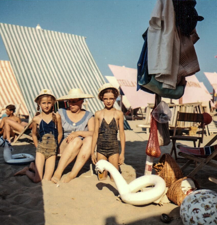 Nach dem Frühstück gingen wir zum Strand. Unser Platz war in der dritten Reihe, um uns italienische und andere Familien aus dem Norden. Ein deutsches Mädchen schlug einmal vor, zu einer Sandbank hinauszuschwimmen. Ich konnte noch nicht gut schwimmen, legte meinen Schwimmring aber statt um den Bauch nur um den Arm. Auf halbem Weg geriet ich in Panik, und wäre es meiner Schwester nicht geglückt, mir den Schwimmring über den Kopf und den andern Arm zu stülpen, wäre ich wohl ertrunken.
