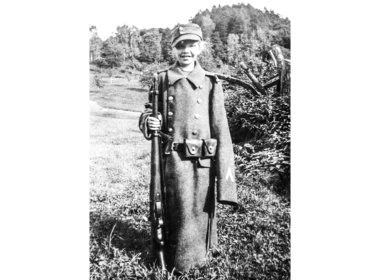 Ganz fachgerecht kann ich meine Kostümierung als militantes Mädchen – und damit ist die Titelfrage schon beantwortet – nicht erläutern. Denn damals, in den 1950er-Jahren, waren Frauen im Militär noch kein Thema und erst recht war ein Mädchen wie ich entsprechend unwissend. Dass das Outfit indes nach Schweizer Armee aussieht, ist offensichtlich. Auch den Karabiner werden ältere Semester erkennen, denn solche Waffen standen ja in jedem Kleiderschrank seriöser Schweizer Väter.