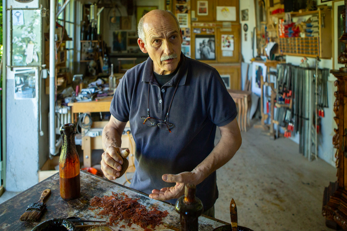 Diese Hände sprechen Bände: Mit ihnen verleiht Franco Ulloni alten Möbeln wieder Schönheit. Eine wichtige Zutat dabei ist Schellack, den der Antikschreiner selber herstellt.