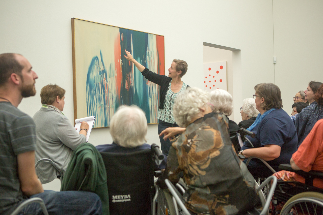 Da hängt es an der weissen Museumswand, grossformatig, Franz Fediers abstraktes Bild ohne Titel von 1959, davor sitzen rund 20 Personen im Halbkreis, einige in Rollstühlen, dahinter Betreuerinnen und freiwillige Begleitpersonen der Generation 60plus. Und zwischen dem Bild und den sieben demenzkranken Frauen vom Rosenberg steht die Museumspädagogin Brigit Meier. „Trotzdem: Menschen mit Demenz erzählen Geschichten“ heisst das Projekt der städtischen Fachstelle für Altersfragen, der Alzheimervereinigung und des Kunstmuseums Luzern.