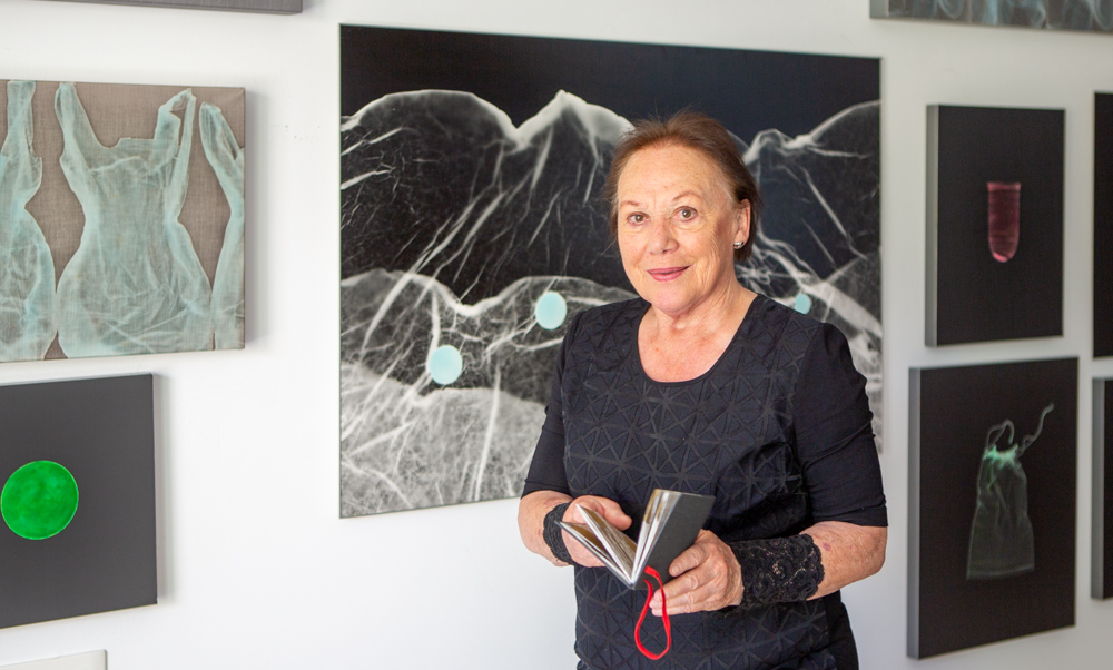 In ihrem hohen, hellen Atelier stehen in einem Gestell die Objekte und Modelle für ihre Plastiken. Die Werke an Wänden und in Schubladen geben Einblick in ihr vielseitiges Schaffen. Sie erzählt, wie ihre Fotogramme entstehen. In der Dunkelkammer legt sie Gegenstände (Plastiksäckchen, Papier usw.) auf eine Unterlage, belichtet und entwickelt sie, koloriert die entstandenen Fotos von Hand und zieht sie auf einen Holzrahmen auf. «So entsteht eine neue Wirklichkeit». Oder sie fügt viele kleine Bilder mit minimen Unterschieden zu einem grossen zusammen, was eine Lebendigkeit bewirkt.