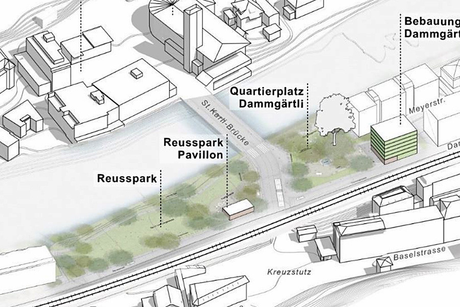 Reusspark und Dammgärtli gemäss dem städtischen Entwicklungskonzept Basel- und Bernstrasse.