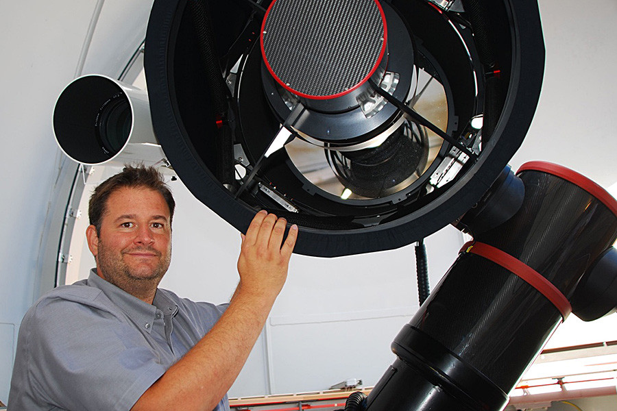 Der Astrophysiker Timm-Emanuel Riesen, Direktor des Stellarium Gornergrat, vor dem Hauptteleskop auf dem Gornergrat. Dieses Instrument wird für Aufnahmen von Galaxien und Nebeln gebraucht. Bild: Roland Poschung
