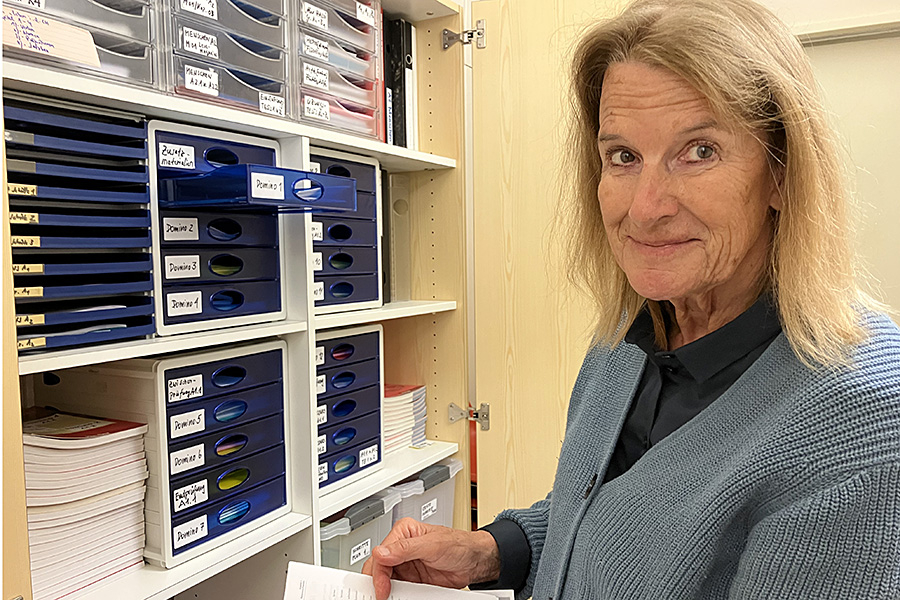 Initiantin und Projektleiterin Ursula Flury zeigt den Schrank, in dem die Unterlagen zum Selberlernen und zur Selbstkontrolle für Tests übersichtlich eingeordnet sind.