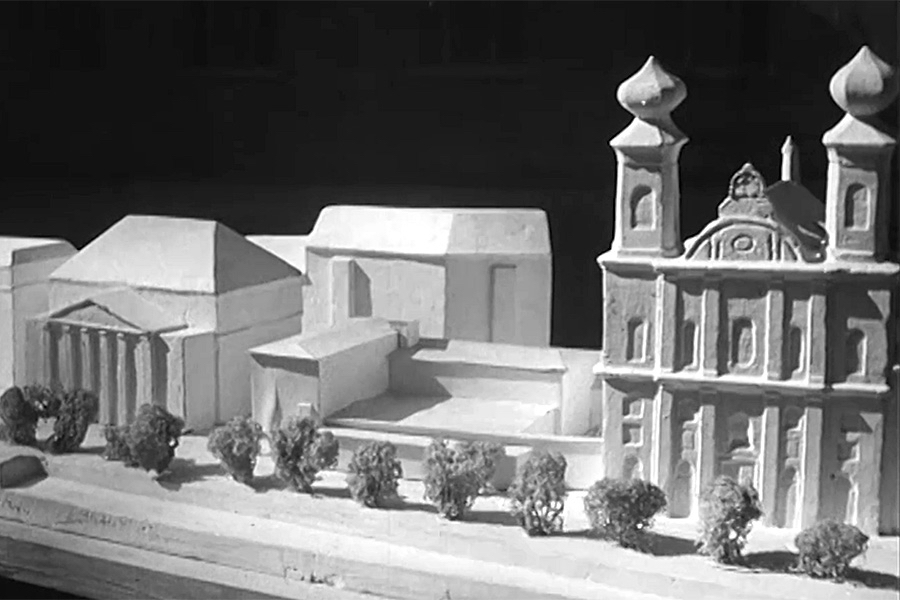 Das Modell der 1949 geplanten Zentralbibliothek – neben der Jesuitenkirche. Heute ist der Platz als Ort für ein neues Theater umstritten. Bild: Still aus der Schweizer Filmwochenschau «Zu viele Bücher – Luzern hat Probleme mit seiner Bibliothek»
