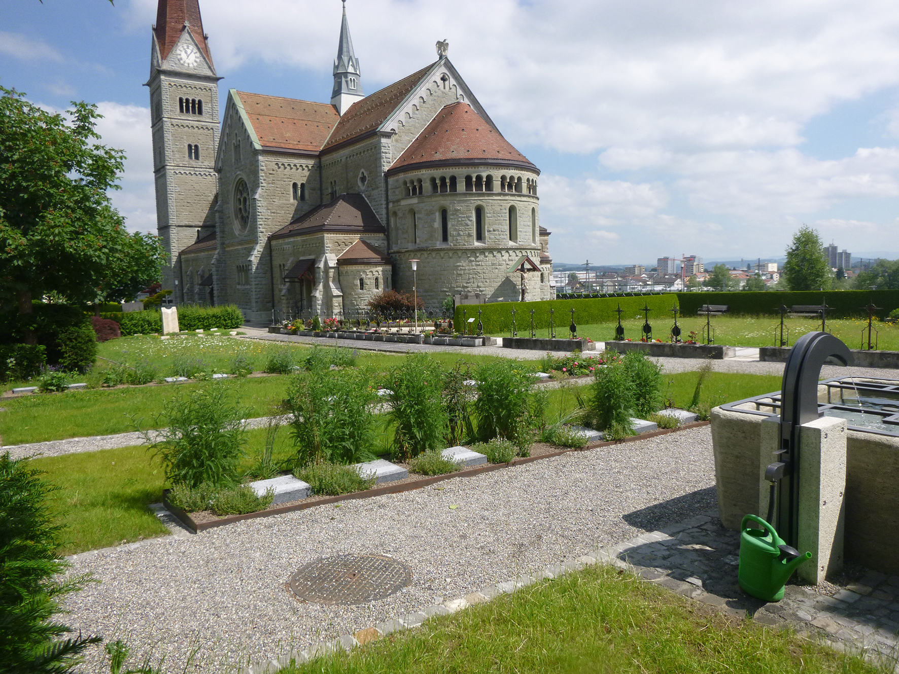 Friedhof Reussbühl mit der Kirche St. Philipp Neri.
