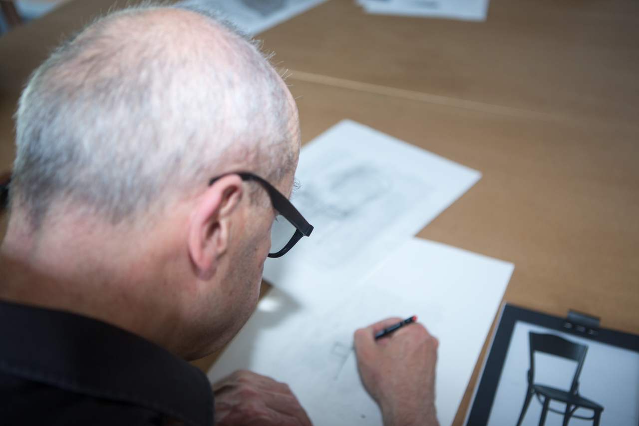 Die gespitzten Bleistifte in diversen Härtegraden liegen auf dem grossen Holztisch bereit, ebenso Zeichenpapier. Ruedi Eggerschwiler, 59, nimmt einen Bleistift Härtegrad 5B, schaut auf die Fotovorlage, Schwarzweiss-Abbild eines Thonet-Stuhls. Mit sechs habe er einen Zeichenwettbewerb in Kriens gewonnen, anlässlich des Schlösslifestes, das Bild wurde ausgestellt, sechs Schnecken waren drauf. Doch nach der Schule hat er das Zeichnen aufgegeben. Jetzt, mit bald 60, hat den Stadtluzerner die Lust gepackt, „wieder etwas mehr Sinnlich-Handwerkliches“ anzugehen. „Zeichnen hat zudem auch etwas Meditatives“, hat er in den letzten Monaten festgestellt.