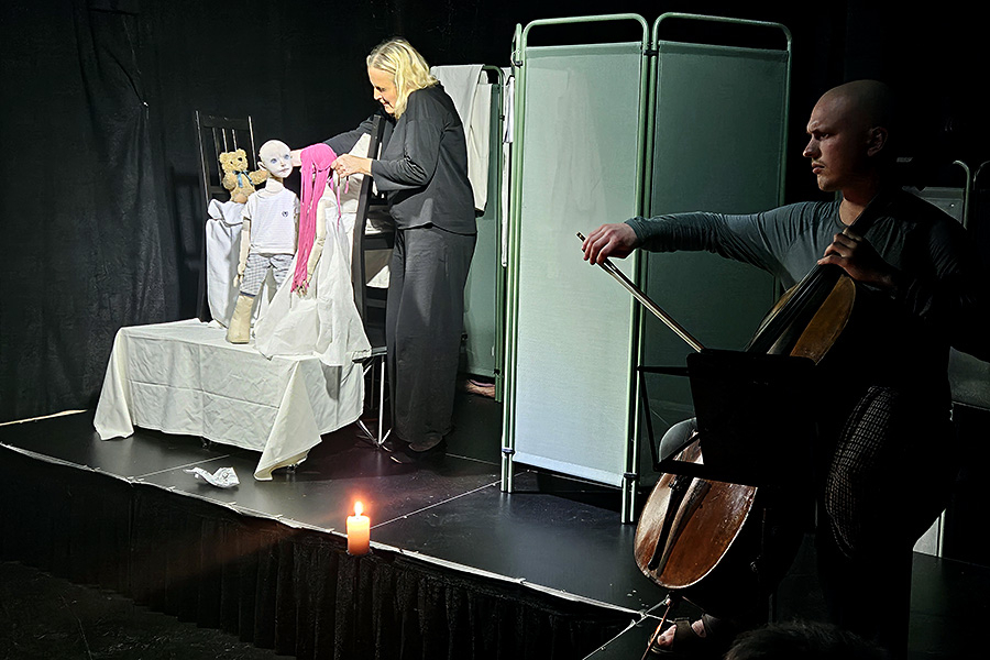 Figurenspielerin Dunjascha Schweizer sinniert in der Rolle des krebskranken Oskar über den Tod. Cellist Gleb Sidoruk begleitet sie.