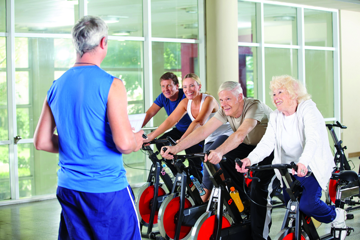 Wer gerne in Bewegung bleiben möchte liegt beim Spinning (Bild) genau richtig. Diese Trainingsform auf einem speziellen Velo ist gelenkschonend und daher bestens geeignet für Frauen und Männer ab 60 Jahren. Gefahren wird in Gruppen im Kursraum zu mitreissender Musik. Dabei wird das Herz-/Kreislaufsystem gestärkt und die Muskulatur gekräftigt. Die Intensität bestimmt jeder Kursteilnehmer selber.