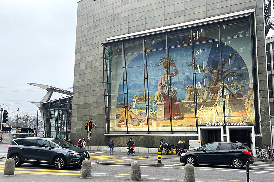 Der Flaneur ist beim Ausgang West angekommen, vor der Treppe zur Hauptpost. Er nimmt sich Zeit für die grosse Weltzeituhr im mehrteiligen farbigen Glasmosaikbild an der Wand. Eilige Einheimische, also fast alle, würdigen das Kunstwerk keines Blickes. Manchmal bleiben Touristen stehen und verfolgen die aufleuchtenden 60 Diodenlämpchen, welche die Sekunden anzeigen. Sie können auf dem Zifferblatt die aktuelle Tageszeit ihres Herkunftslandes ablesen.