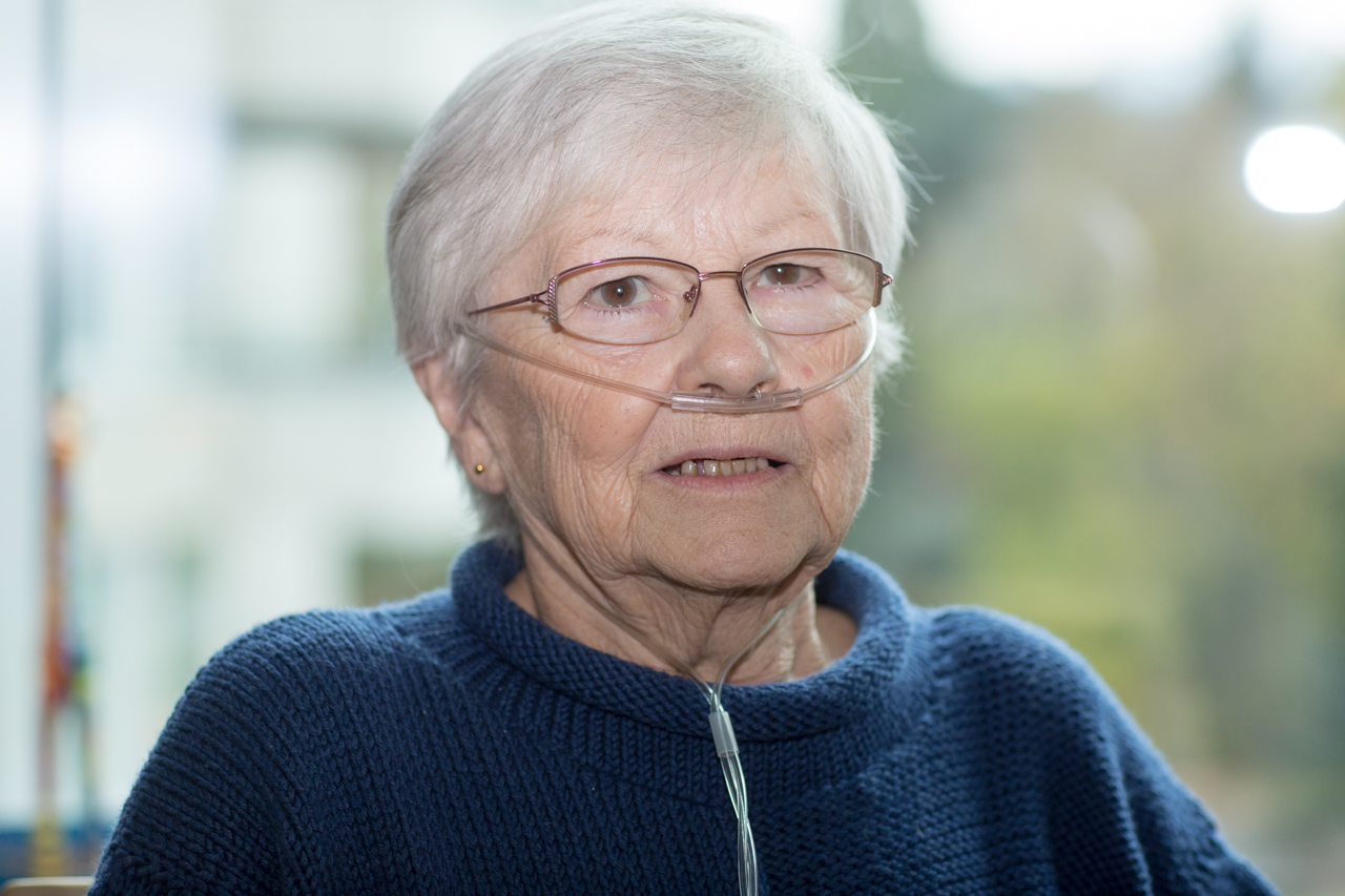 „Ich fühle mich hier freier als Zuhause. Ich nehme die Sauerstoffflasche und gehe in die Cafeteria oder auch zum Spaziergang in den Park. Dort kann ich den Vögeln zusehen oder auch den Geissen.“ Auf der Palliativabteilung hat man rasch reagiert, als sich herausstellte, dass das Aufladen der Sauerstoffflaschen – drei stehen zur Verfügung – zu viel Zeit beanspruchte. Maria Dubacher musste die Flasche fast nach jedem Spaziergang zum Aufladen bringen. Der Sauerstoff reicht etwa drei Stunden. Inzwischen ist ein Sauerstofftank angeschafft worden. Wenn eine Flasche leer ist, kann Maria Dubacher einfach eine volle holen. Im Zimmer selbst jedoch und vor allem in der Nacht ist Maria Dubacher mittels Schlauch mit einem Apparat verbunden, der die Luft direkt in Sauerstoff umwandelt.