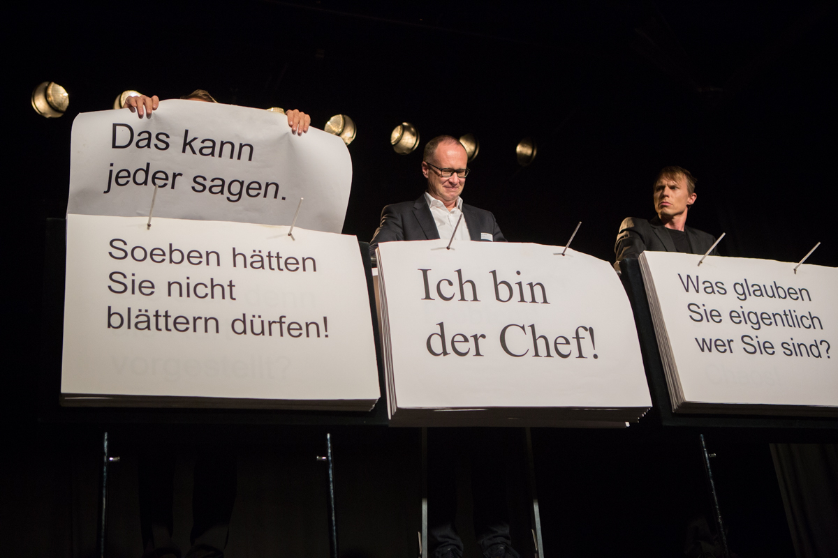 Höhepunkt des kurzweiligen Abends war der Auftritt des Kabarettduos "Ohne Rolf", welcher das Publikum begeisterte. Im Schlussteil traten "Ohne Rolf" für einmal mit Martin auf - sie baten den in ersten Reihe sitzenden Sozialdirektor zu einem Spontanauftritt auf die Bühne. Er löste seine Aufgabe mit Bravour, und mit dem Plakat "Ich bin der Chef" hatte er die Lacher auf seiner Seite. Vielleicht haben Politik und Kabarett mehr miteinander zu tun als man gemeinhin denkt. - BB /18.5.2018