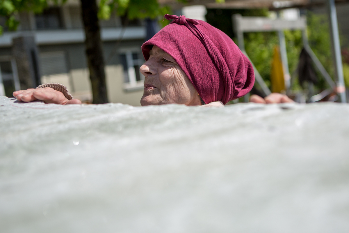 Nadja hat keinen Lieblingsstein. Jeder sei anders. Der Stein sage ihr, was geht und was nicht. Sie habe sich zu fügen. Für sie ist klar: Hier im Brünighof muss es ein Verde Spluga sein – ein hellgrüner, schwach geschieferter, mittelkörniger Gneis mit Quarz-Einschlüssen, weisser schlierig-wolkiger Textur und gröberen, milchig-weissen Gemengeteilen. Fast ein wenig wie Bob Dylan? Der grüne Splügenstein wird in einem Steinbruch auf der italienischen Seite des Splügenpasses unter Tag abgebaut. Der Verde Spluga ist 250 Millionen Jahre alt – Nadja 64. Steine hätten eine Geschichte, die man nicht nachvollziehen oder schaffen könne, sagt Nadja. Sieben Mal ist sie zum Steinbruch nach Italien gefahren, um den Stein auszuwählen, das Ausbrechen zu überwachen und den Abtransport zu organisieren. Im Januar ist der Stein im Vorplatz ihres Ateliers zwischen Viscose-Stadt und Emme eingetroffen: Vier riesige Klötze nahezu gleich hoch wie die zierliche Bildhauerin.