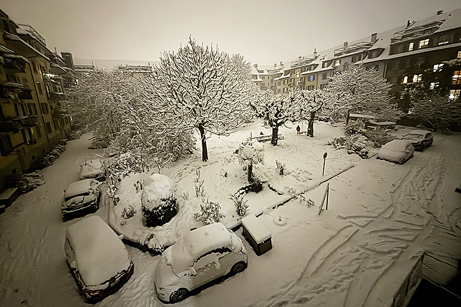 Der Stillstand dauerte, die Räder der Fahrzeuge drehten durch, meine Freundin und ich setzten unsere Plauderstunde fort. Nach 90 Minuten erreichten wir das Paulus-Quartier, das sich bereits tief verschneit präsentierte. Dort, wo sonst abends die Quartierstrassen als Schleichwege von den Ortskundigen benutzt werden und die Jagd nach Parkplätzen in der blauen Zone jeweils beginnt, lag der Schnee unberührt und hoch auf der Strasse, hie und da ein paar Fussspuren.