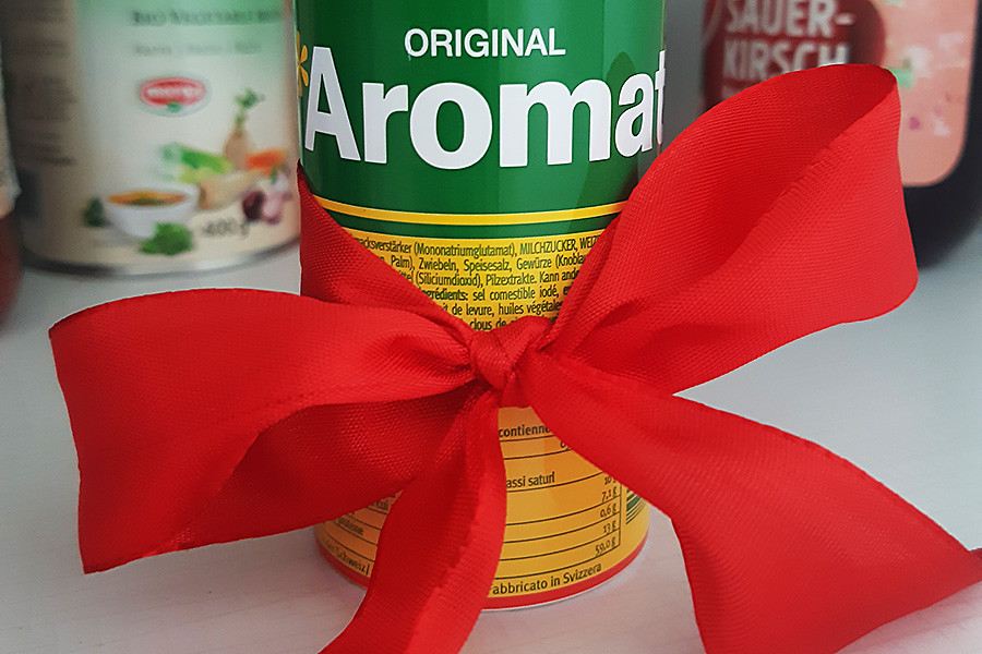 Oder einer Aromat-Streudose, weil der Lebenspartner von dieser seit Kindheit vertrauten Würze nicht lassen kann. Eine kleine Geste der Aufmerksamkeit – aber nur, wenn die Schenkende grosszügig darüber hinwegsieht, wenn der Beschenkte mit dem gelblichen Pulver hingebungsvoll die von ihr zubereiteten Köstlichkeiten «verfeinert».