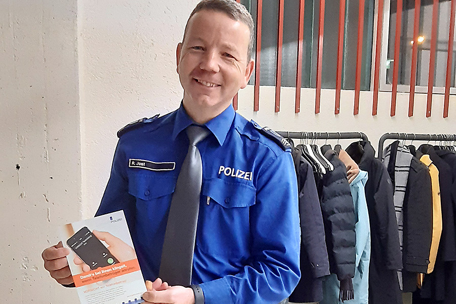 Roland Jost, Chef Sicherheitsberatung der Luzerner Polizei, mit einem Präventionsflyer zum Thema Telefonbetrug. Bild: Eva Holz