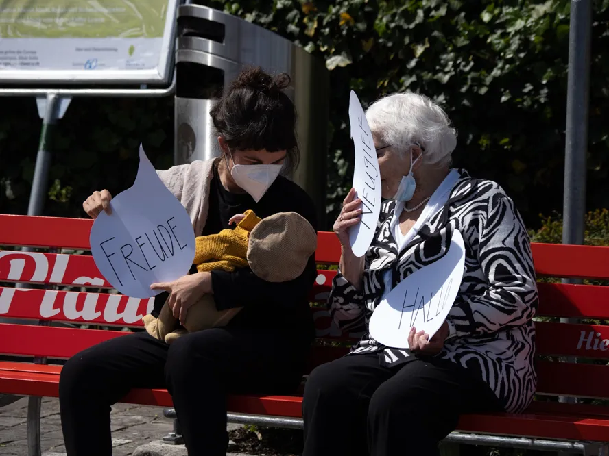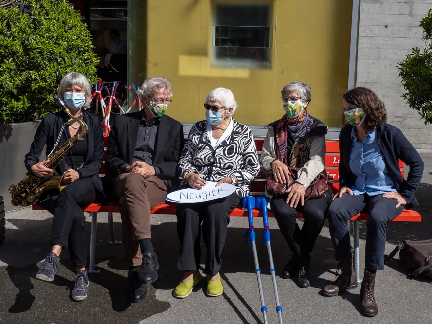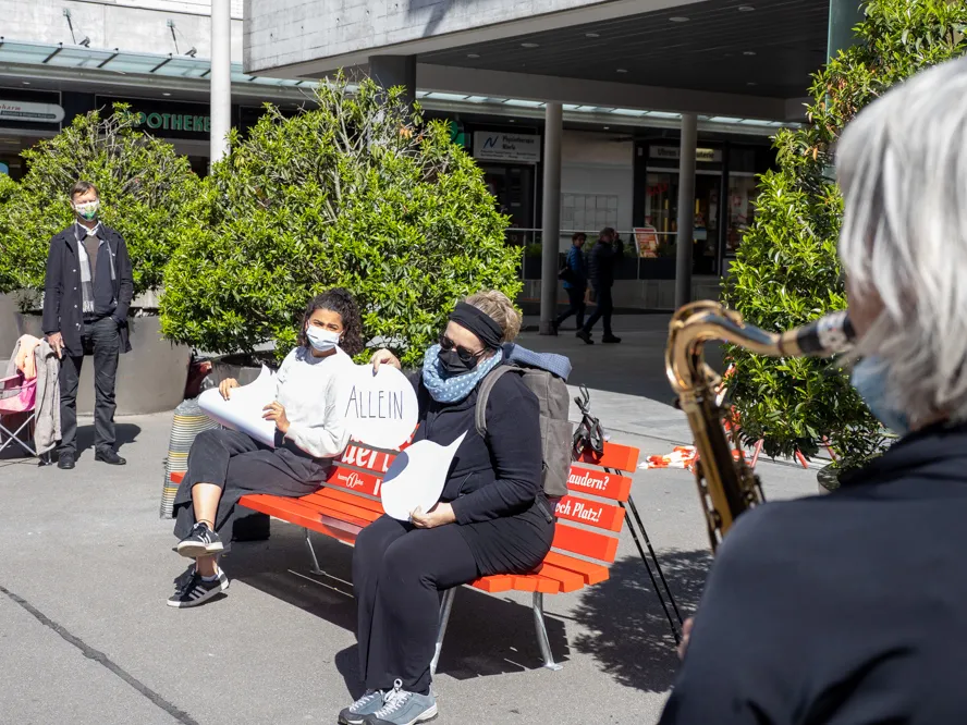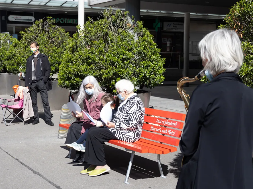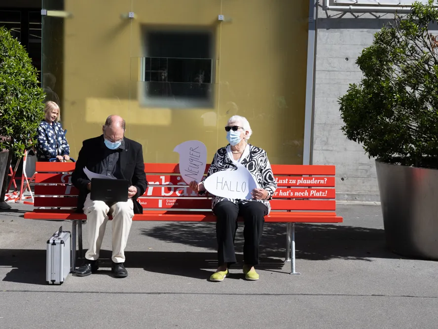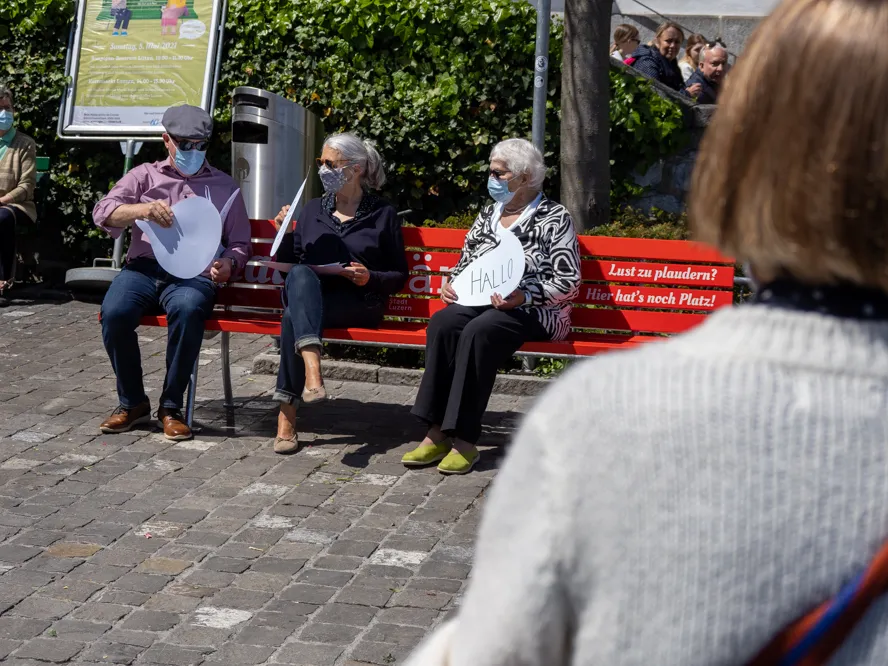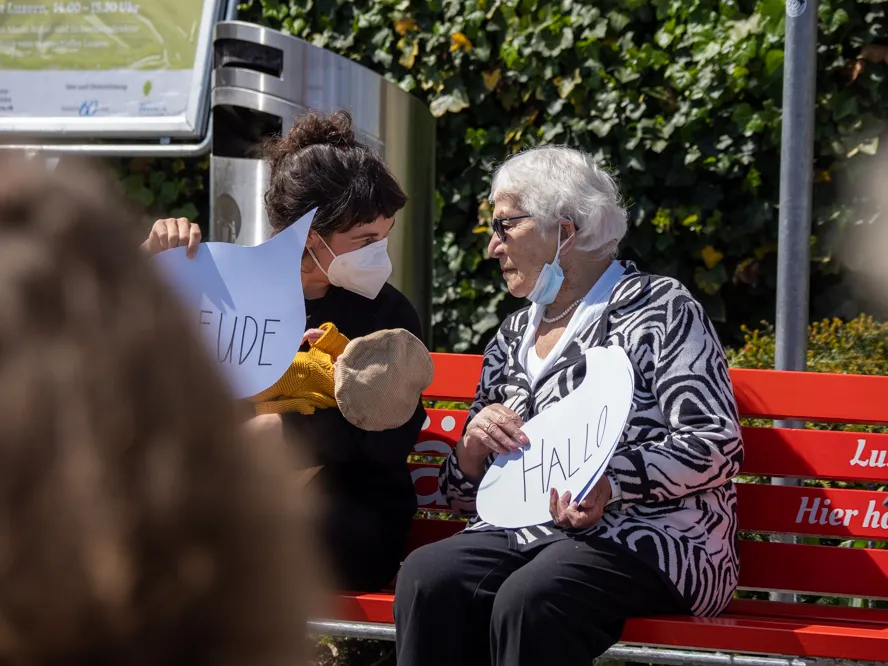 Verena, eine ältere Frau, sitzt allein auf der Bank am Flohmarkt in Ruopigen. Eine jüngere Frau beginnt mit dem Saxofon zu spielen. Ein Geschäftsmann setzt sich mit Aktenkoffer und Laptop zur älteren Frau auf der Bank. Sie tragen Maske und kommen trotzdem ins Gespräch – mit hochgehaltenen Plakatwörtern: Hallo und Arbeit, Neugier und Leben. Sie gehören zu einer Spielszene des theaterKoffers Luzern und sitzen auf einem der angeschriebenen Plauderbänkli. Es ist eine von zwei Veranstaltungen zur Einweihung dieser Aktion gegen die Vereinsamung. Unter dem Motto: «Möchten Sie lieber reden als schweigen, dann sind Sie auf dem Plauderbänkli goldrichtig!» Die Initiative ging von der Arbeitsgruppe Soziale Teilhabe des Forums Luzerns60plus aus, umgesetzt wurde sie von der Stadtgärtnerei und den luzernermalern.