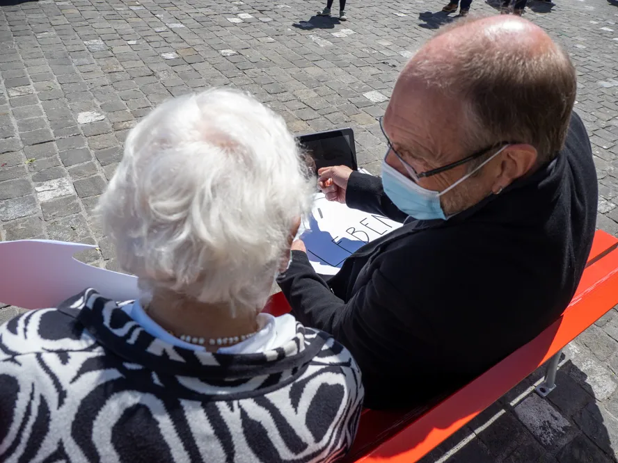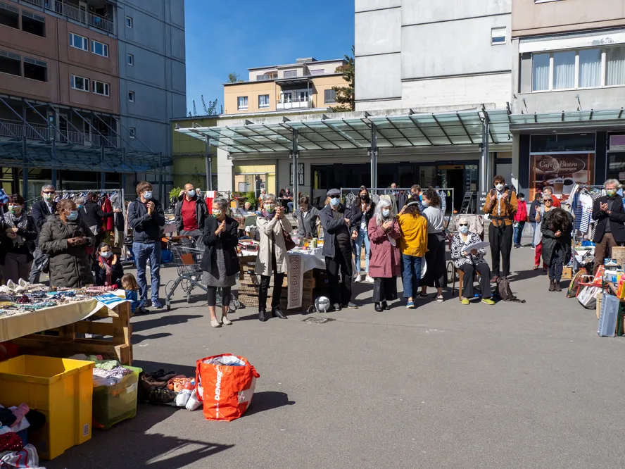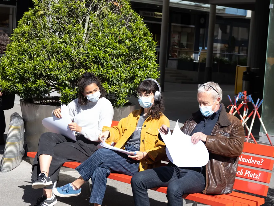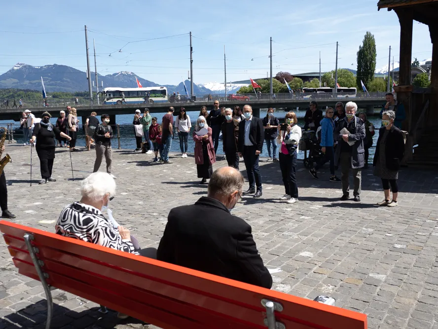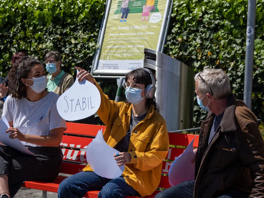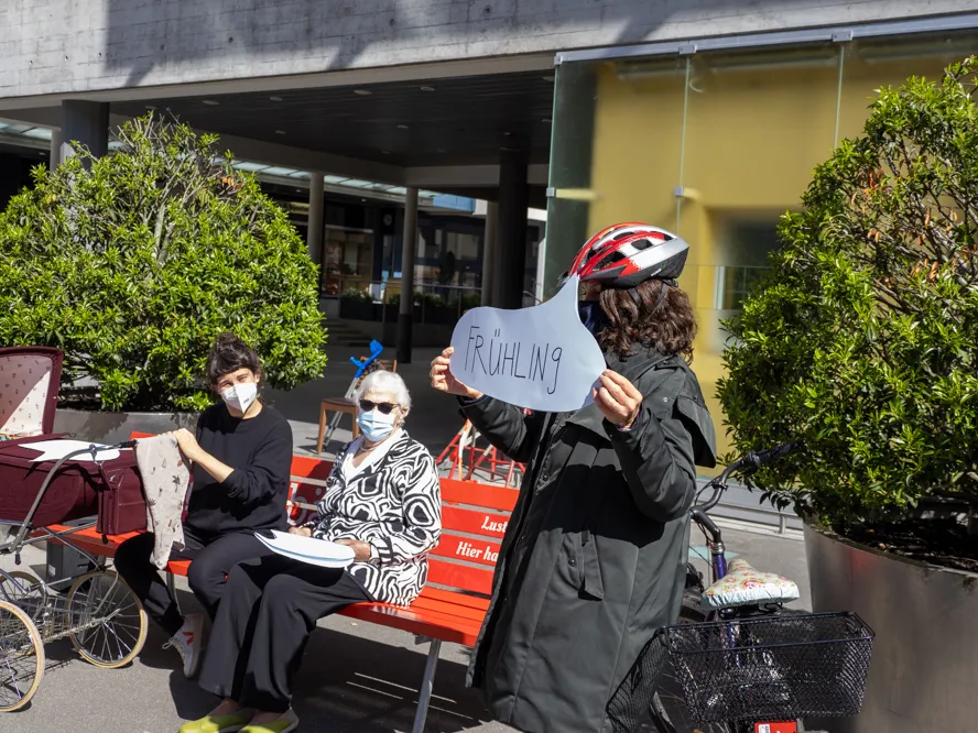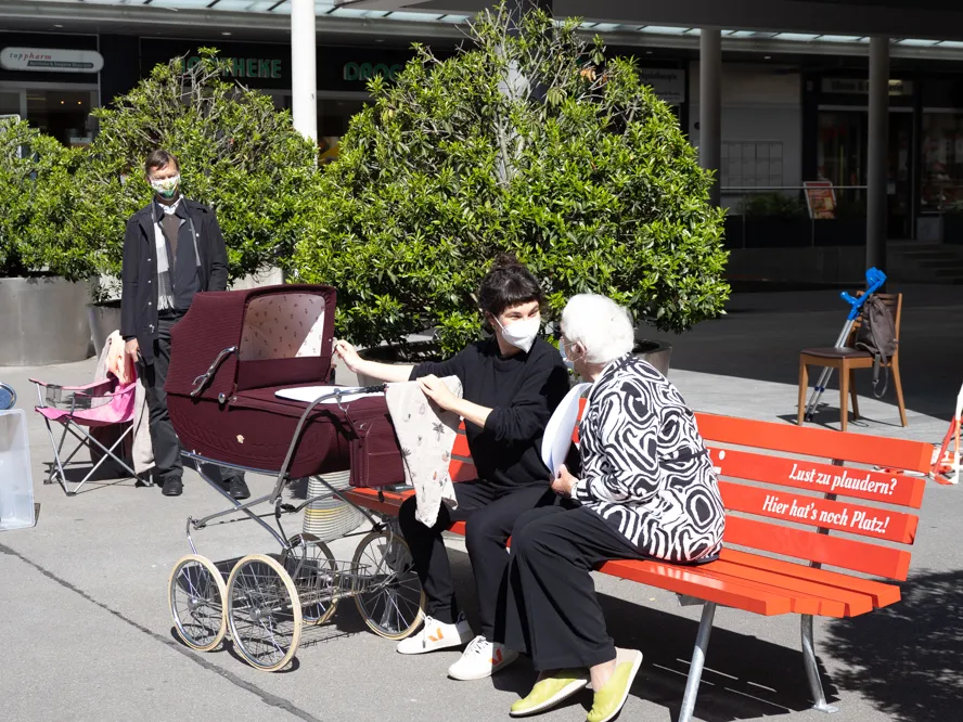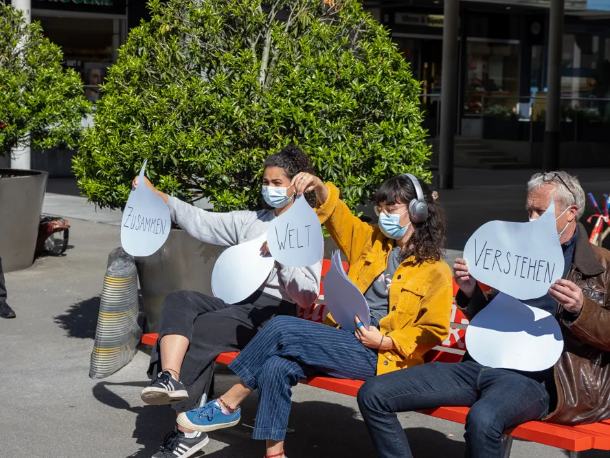 Verena, eine ältere Frau, sitzt allein auf der Bank am Flohmarkt in Ruopigen. Eine jüngere Frau beginnt mit dem Saxofon zu spielen. Ein Geschäftsmann setzt sich mit Aktenkoffer und Laptop zur älteren Frau auf der Bank. Sie tragen Maske und kommen trotzdem ins Gespräch – mit hochgehaltenen Plakatwörtern: Hallo und Arbeit, Neugier und Leben. Sie gehören zu einer Spielszene des theaterKoffers Luzern und sitzen auf einem der angeschriebenen Plauderbänkli. Es ist eine von zwei Veranstaltungen zur Einweihung dieser Aktion gegen die Vereinsamung. Unter dem Motto: «Möchten Sie lieber reden als schweigen, dann sind Sie auf dem Plauderbänkli goldrichtig!» Die Initiative ging von der Arbeitsgruppe Soziale Teilhabe des Forums Luzerns60plus aus, umgesetzt wurde sie von der Stadtgärtnerei und den luzernermalern.