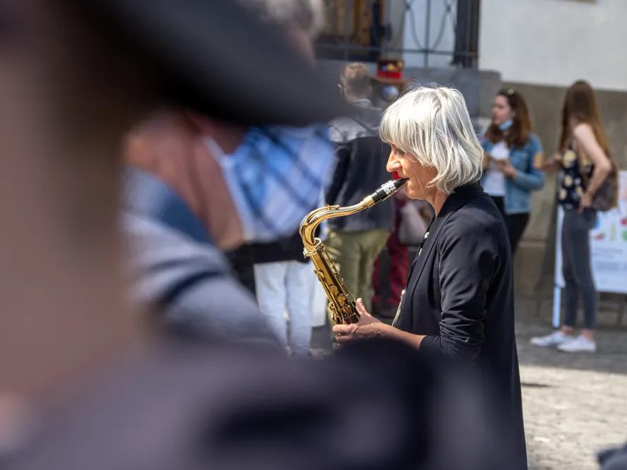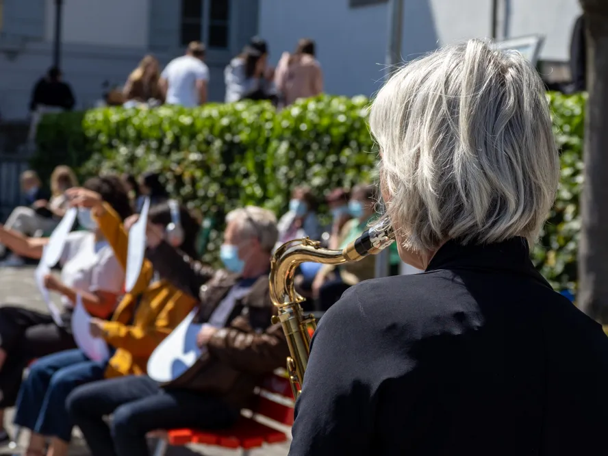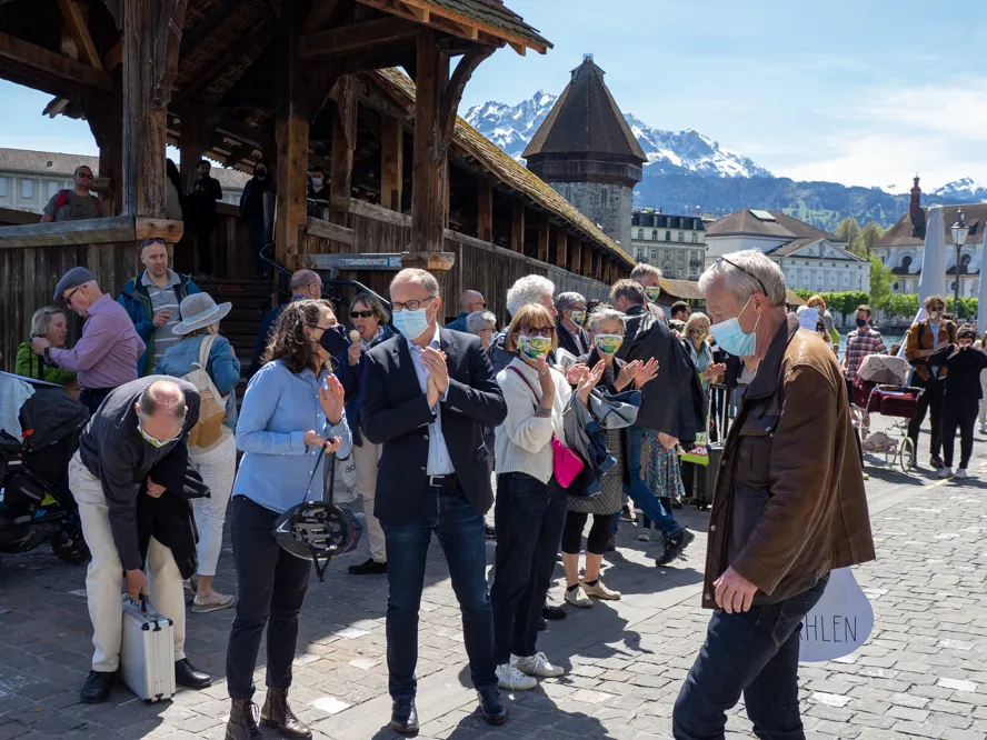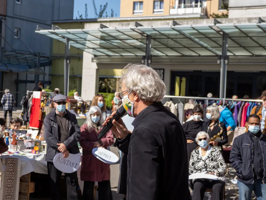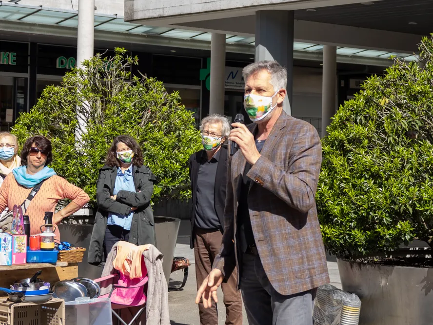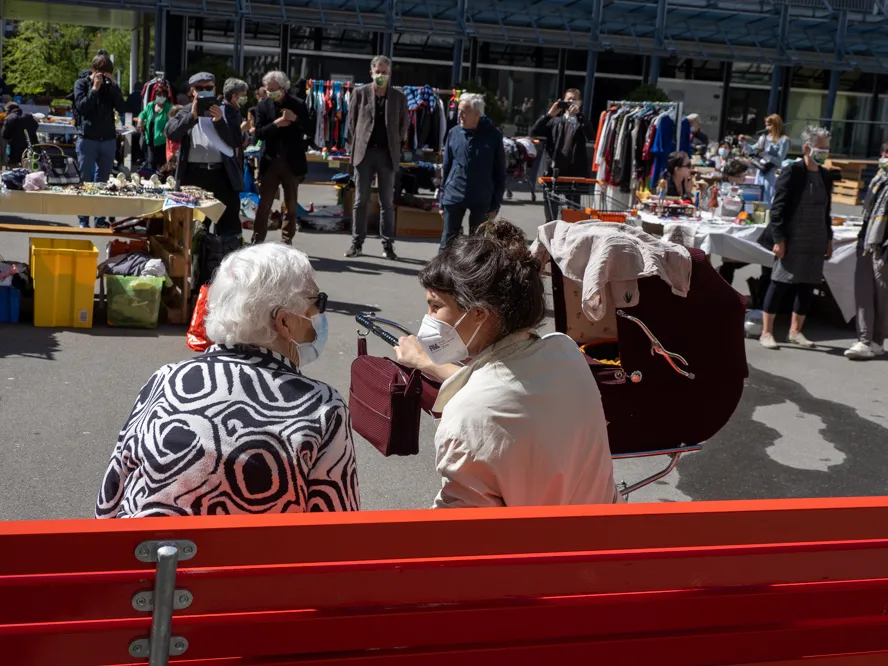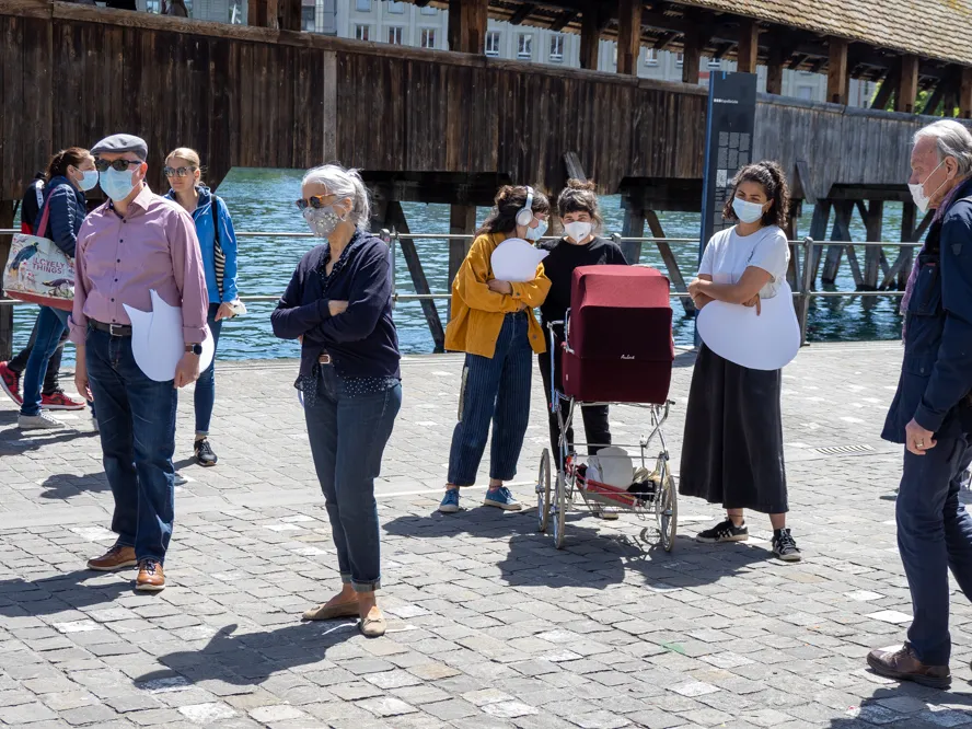 Verena, eine ältere Frau, sitzt allein auf der Bank am Flohmarkt in Ruopigen. Eine jüngere Frau beginnt mit dem Saxofon zu spielen. Ein Geschäftsmann setzt sich mit Aktenkoffer und Laptop zur älteren Frau auf der Bank. Sie tragen Maske und kommen trotzdem ins Gespräch – mit hochgehaltenen Plakatwörtern: Hallo und Arbeit, Neugier und Leben. Sie gehören zu einer Spielszene des theaterKoffers Luzern und sitzen auf einem der angeschriebenen Plauderbänkli. Es ist eine von zwei Veranstaltungen zur Einweihung dieser Aktion gegen die Vereinsamung. Unter dem Motto: «Möchten Sie lieber reden als schweigen, dann sind Sie auf dem Plauderbänkli goldrichtig!» Die Initiative ging von der Arbeitsgruppe Soziale Teilhabe des Forums Luzerns60plus aus, umgesetzt wurde sie von der Stadtgärtnerei und den luzernermalern.