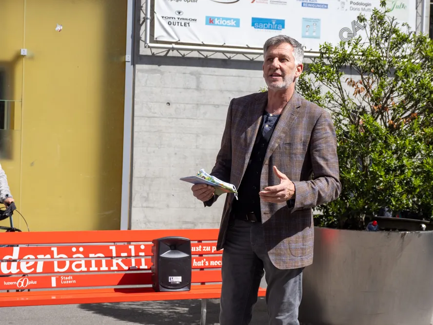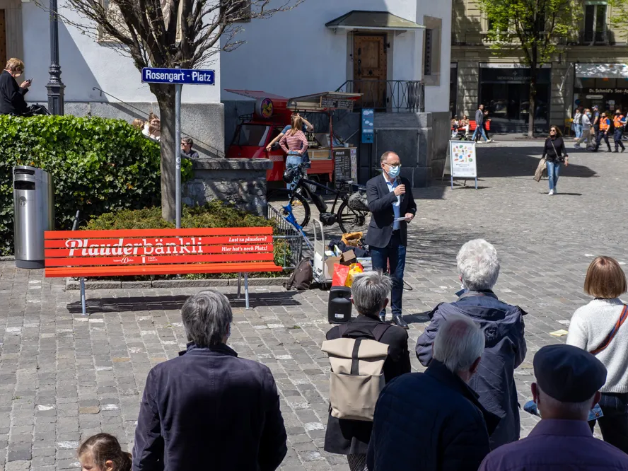 Die Aktion Plauderbänkli will «mit einem Augenzwinkern», wie Stadtrat Adrian Borgula bei der Einweihung in Ruopigen sagte, die persönlichen Begegnungen im öffentlichen Raum auf zwanglose Art ermöglichen. In seiner kurzen Ansprach nahm der städtische Umwelt- und Mobilitätsdirektor die Formel Zusammen Welt verstehen auf, wie sie sich auf dem Plauderbänkli mit drei Postern ergab, um das Anliegen der Aktion zu verdeutlichen. Miteinander plaudern und ins Gespräch kommen hilft, um nicht allein zu sein. Insgesamt stehen in der Stadt Luzern nun 30 rote und grüne Plauderbänkli. Aber selbstverständlich lässt sich auch auf den anderen 1400 Sitzbänken, die auf städtischen Gebiet stehen, ein Gespräch über Gott und die Welt anzetteln. – 10.5.2021