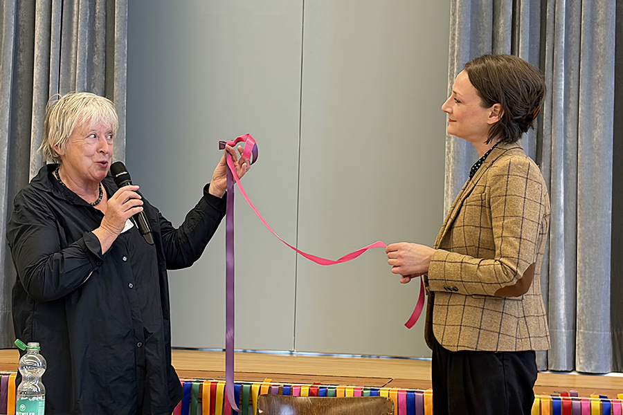 Vorstandsmitglied Veronika Bossard (l.) überreicht der Referentin Franziska Schutzbach den gemeinsam geknüpften Knopf als bleibendes Zeichen der Verbundenheit. Bild: Monika Fischer