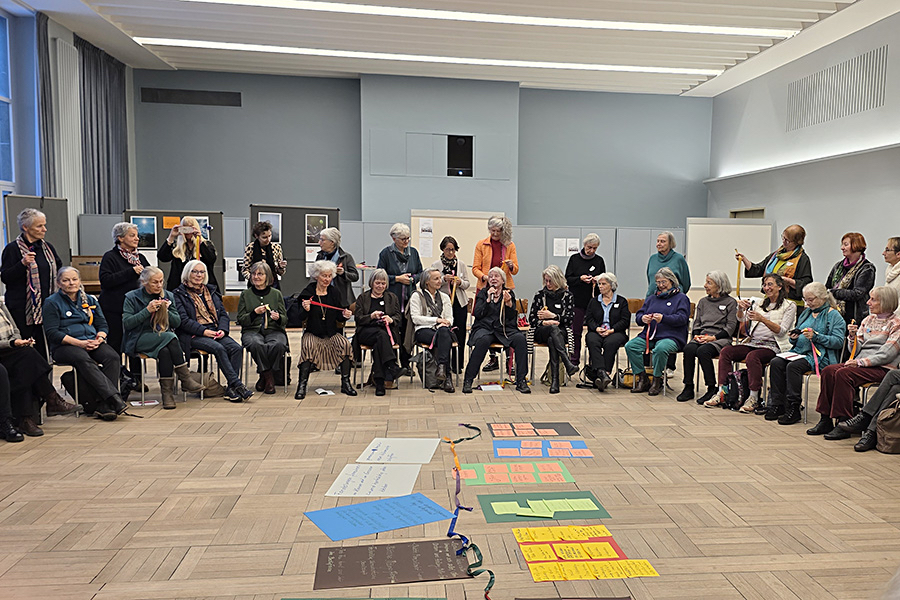 An der ausgebuchten Herbsttagung des Vereins Grossmütter-Revolution knüpften die 100 Teilnehmerinnen ein vielfarbiges Band als Zeichen der Verbundenheit trotz Differenzen. Bild: Irmgard Bayard