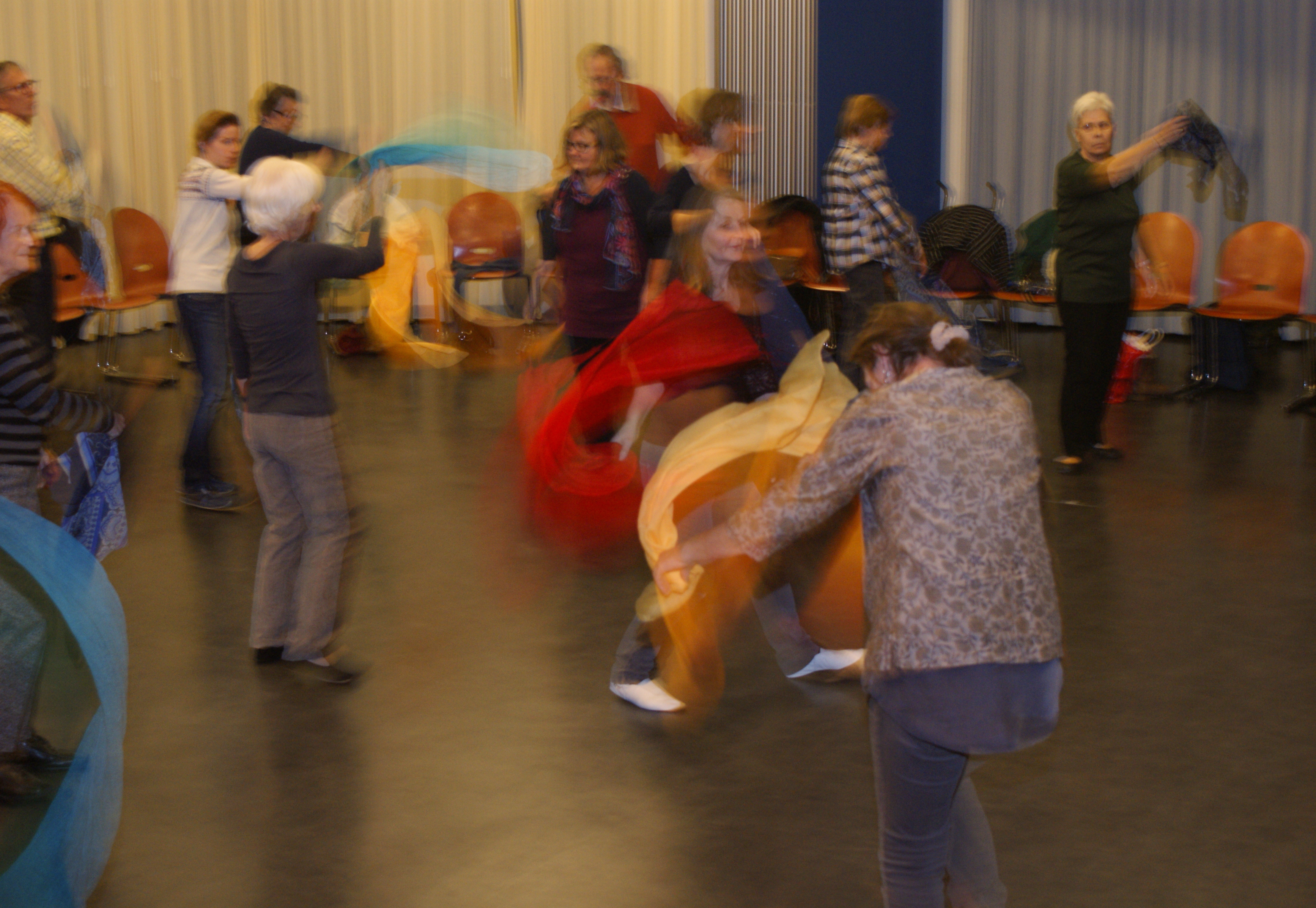 Zwölf Frauen und zwei Männer lassen sich an diesem Abend Flügel wachsen, einfühlsam angeleitet von Regula Hasler. Zum Einstieg liest eine Teilnehmerin ein Herbstgedicht, das wunderbar vom Wort zur Bewegung überleitet. Kein Zwang herrscht, jede und jeder kann sich seine Bewegungen aussuchen, solo oder in Gruppen. Sie sind diesmal zwischen 40 und 92, manchmal sind auch Jüngere dabei. Es braucht keine Anmeldung – alle nehmen teil, wann es ihnen passt: Jeden Montag, ausser in den Schulferein und ausser am letzten Montag des Monats wird von 18.00 bis 19.15 getanzt. Mal sind Schirme, mal Fächer, dann wieder Tücher als Objekte mit dabei. Anschliessend gibt es frischen Süssmost und ein paar feine Häppchen. Mitmachen ist kostenlos, für freiwillige Beiträge steht eine Kartonbox auf einem Stuhl. Ab nächsten Januar findet „Tanzen beflügelt“ auch im St. Leodegar statt, organisiert von der Katholischen Kirche und von Volare.
