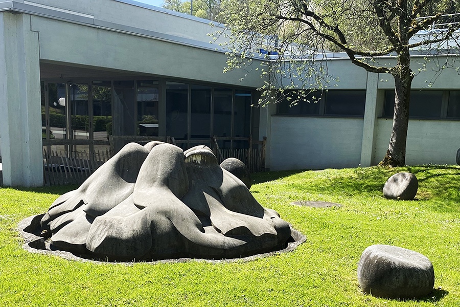 Nächster Halt ist das 1975 eröffnete Schulzentrum Utenberg, damals Luzerns grösste Schulanlage «der Superlative» (so stand es in den LNN). Die 600 Schülerinnen und Schüler waren auf 21 Klassen verteilt (hallo Klassengrösse heute!). 19,55 Millionen Franken hatte der Bau gekostet (hallo Teuerung: Ebenso viel kostete dreissig Jahre später die Sanierung). Zehn Kunstschaffende waren eingeladen, ein Projekt zur künstlerischen Wand- und Platzgestaltung einzureichen. Die aus Männern bestehende Jury mit der dominierenden Figur Jean-Christoph Ammann, Direktor – damals «Konservator» genannt – des hiesigen Kunstmuseums, entschied sich für die Doppel-Eingabe von Andreas Gehr und Olga Zimmelova.