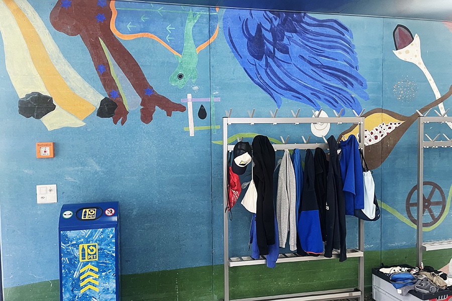 Für das Künstlerpaar, frisch verheiratet, kam der Auftrag wie ein Hochzeitsgeschenk daher, war allerdings mit auszuführender Arbeit verbunden. Auf der 15 Meter langen Wand in der Eingangshalle zum Turnhallentrakt malte Olga eine märchenhafte Szenerie mit schwebenden und schwimmenden Formen aus Botanik und Zoologie unter dem Regenbogen in einem Aquarium. Wie das in öffentlichen Bauten oft der Fall ist: Ein Teil des Bildes ist durch zwei Garderobeständer und einer Abfallbox verstellt.