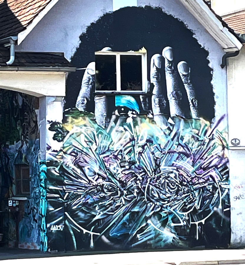 Auf der anderen Strassenseite döst das geschlossene Restaurant «Untergrund» vor sich hin. Der Flaneur erinnert sich an die tote Bärin aus dem Basler Zoo, die 1962 tiefgefroren vor dem Eingang hing. Zwei Tage später wurde ihr zum Gaudi der Klientel das Fell über die Ohren gezogen, der Protz zerlegt, gebeizt und gewürzt, gebraten und geschnitten am Tisch serviert. Das Wandbild am Haus erinnert an die Arbeit der Steinhauer im einstigen Steinbruch dahinter. Die Männer pickelten jahrzehntelang am Felsen unter dem Gütsch, es war der grösste Steinbruch in der Stadt. Signiert ist die dem Steinmetzen-Patron Sankt Reinold gewidmete Darstellung mit «HZ» und «HB». Es handelt sich um den Künstler und Kunstgewerbler Hans Zürcher und Malermeister Heini Bühlmann.