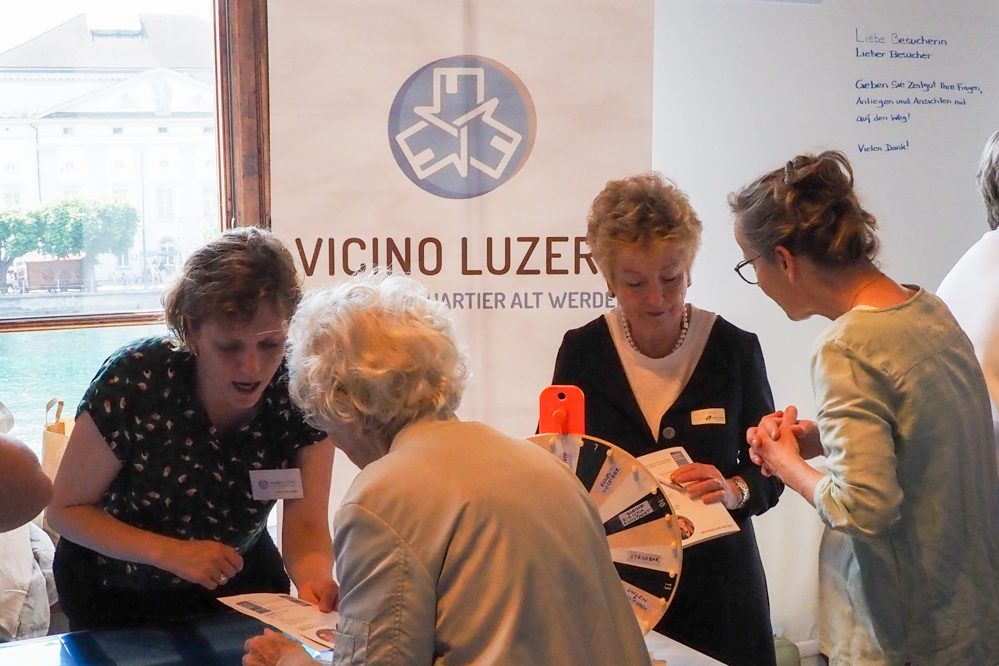 Es gab viele Besucher am Marktplatz, die froh waren um Informationen, wie hier am Stand von Vicino Luzern. Die Organisation leistet Nachbarschaftshilfe.