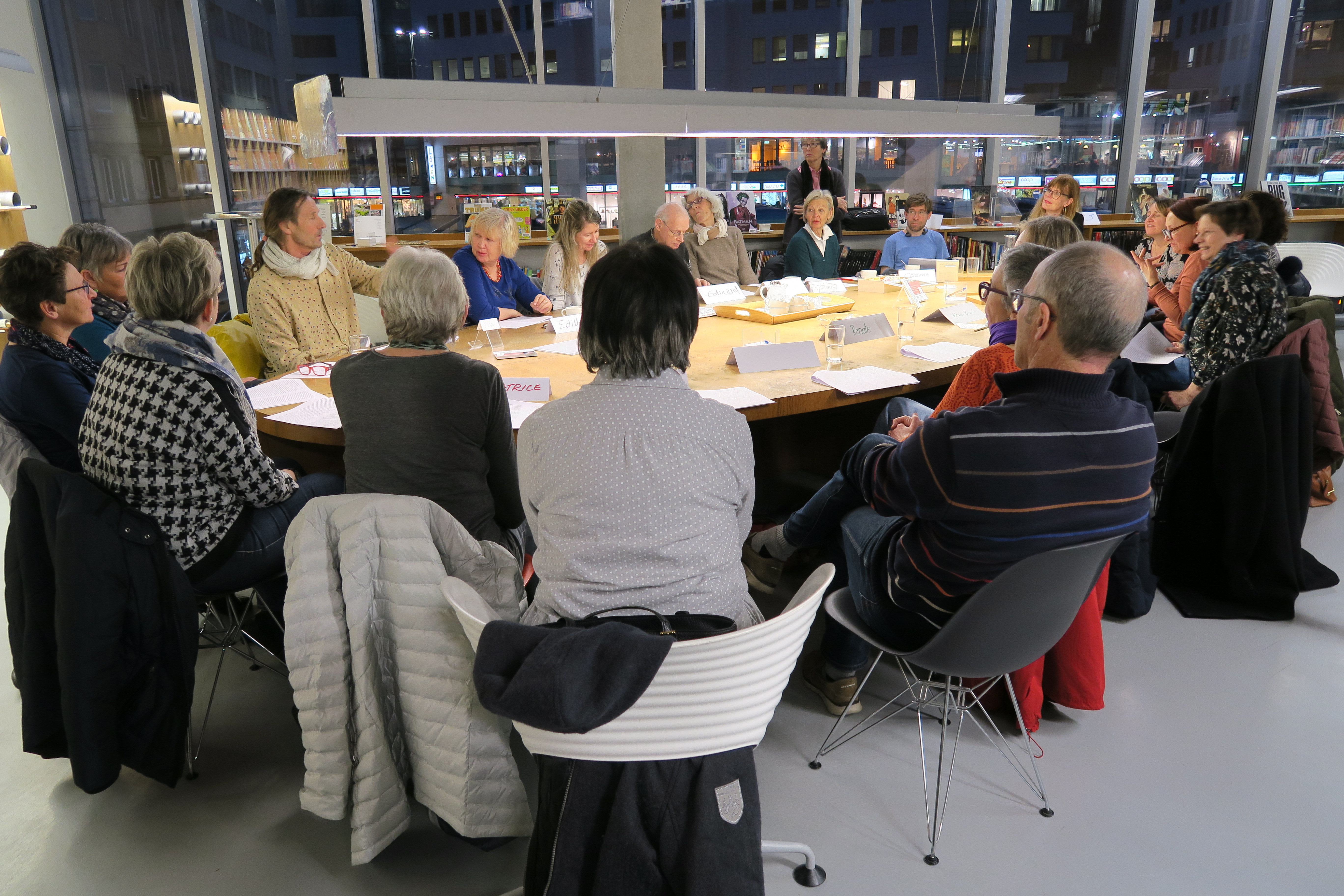 Ein grosser ovaler Tisch, darum herum 16 Frauen und vier Männer, es gibt Tee oder Wasser und dazu süsse Kambly-Bretzeli. Vor den Wartenden stehen Namensschilder mit dem Vornamen. Es ist 17.30 Uhr. Draussen leuchten die Nachtlichter des Löwencenters und rollt und rauscht der Abendverkehr. Im Bibliotheksraum herrscht gespannte Ruhe. Nicole Fall, Bereichsleiterin der Stadtbibliothek Luzern und ausgebildete Shared Reading Facilitator, verteilt einen Text, der in den nächsten 80 Minuten vorgelesen und besprochen wird, ohne Zwang, ohne Vorkenntnisse, ohne Druck.
