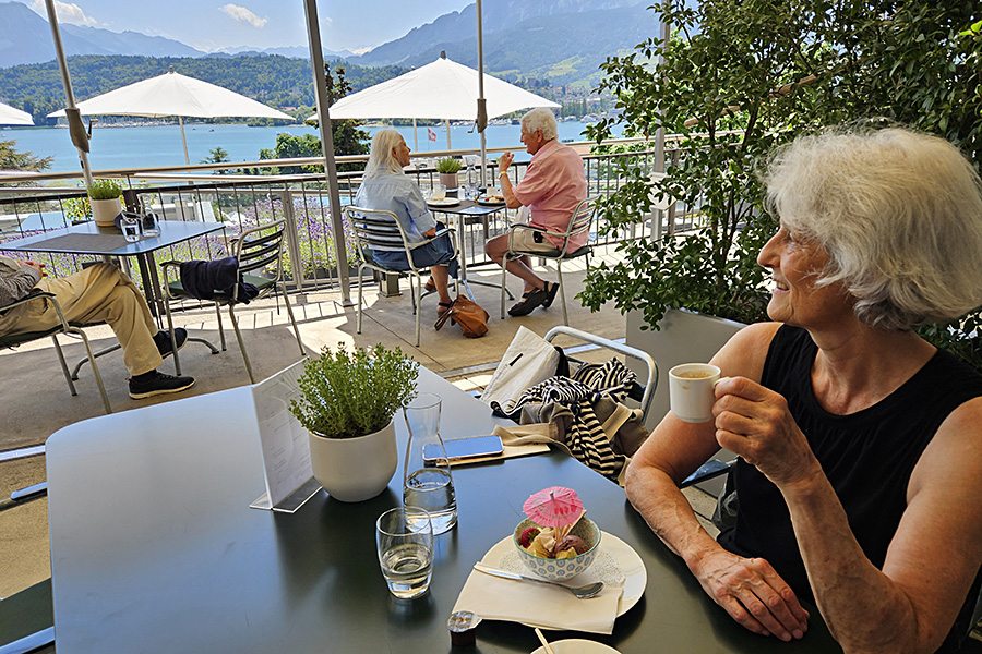 Es gab diesen Sommer ein paar Tage, da es sich vorzüglich im Freien speisen liess. Wir haben die Gelegenheit rechtzeitig genutzt und uns auf zwei aussichtsreiche Terrassen gesetzt, wo sich gemeinhin medizinische Fachkräfte, Menschen auf dem Weg zur Genesung oder Betagte verwöhnen lassen, wo man aber ausdrücklich auch Gäste von aussen willkommen heisst. Den Hauptgang genossen wir im Restaurant Santé der Hirslanden Klinik St. Anna: einmal Pouletcurry mit indischem Gemüse, einmal Felchenfilet aus dem Vierwaldstättersee an Beurre-blanc-Sauce – beides köstlich zu je 26 Franken.