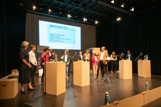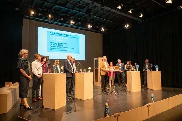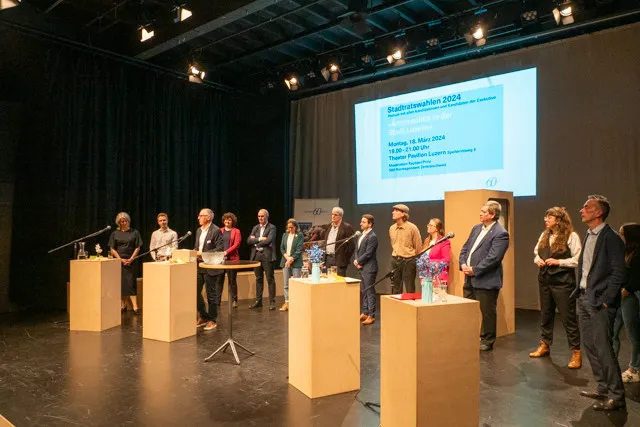 Von links nach rechts: Franziska Bitzi (Mitte, bisher), Benedikt Aregger (Junge Mitte), Korintha Bärtsch (Grüne), Beat Züsli (SP, bisher), Melanie Setz (SP), Julian Gerber (Junge Grüne), Marco Baumann (FDP), Peter With (SVP), Peter Meyer (Präsident Forum Luzern60plus), Zoé Stehlin (JUSO), Urban Frye (parteilos), Anna-Sophia Spieler (Junge FDP), Anna-Lena Beck (Junge GLP), Stefan Sägesser (GLP).