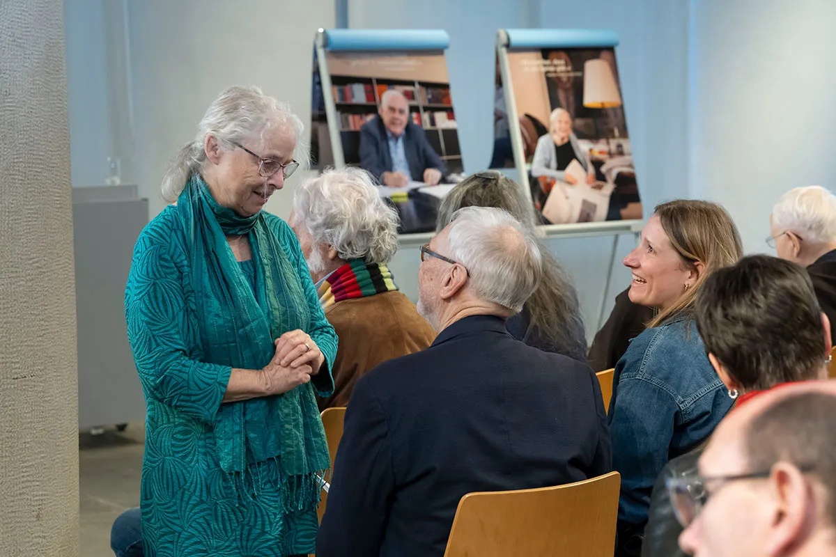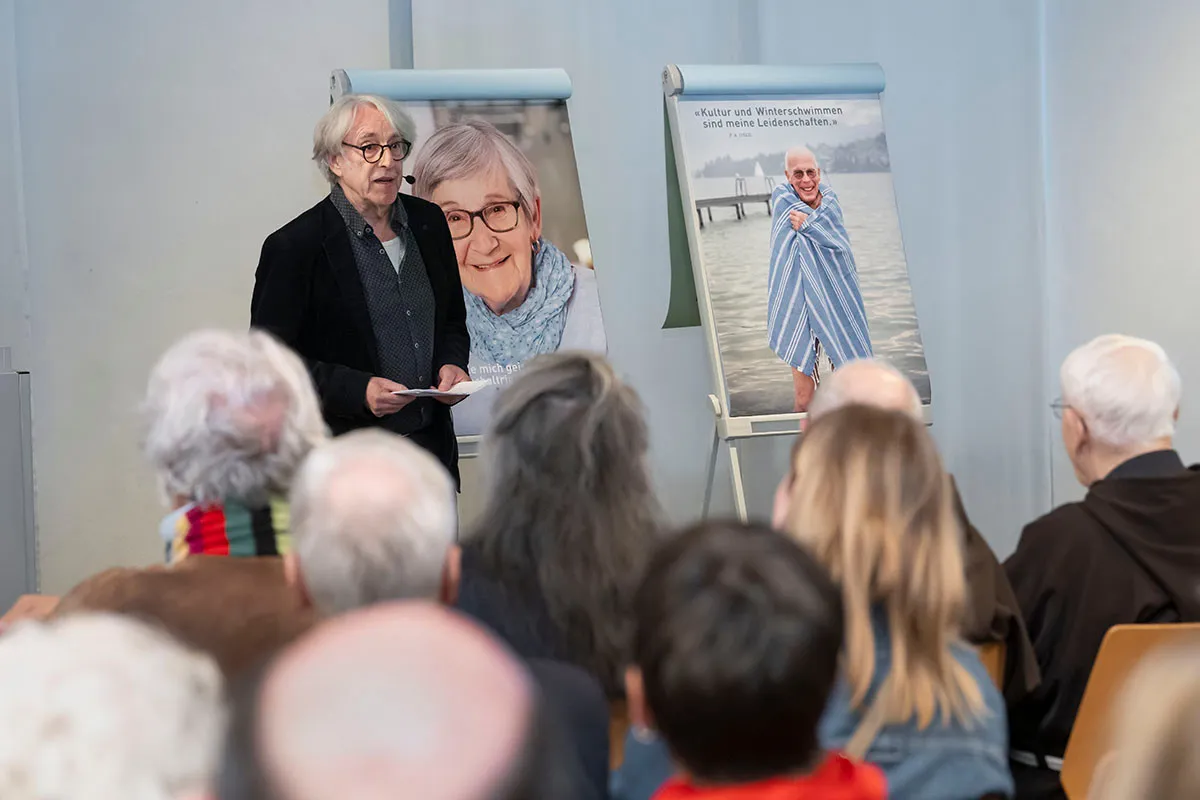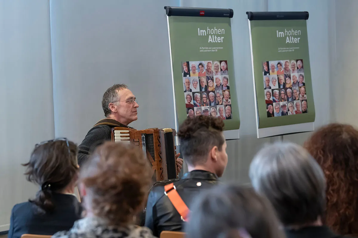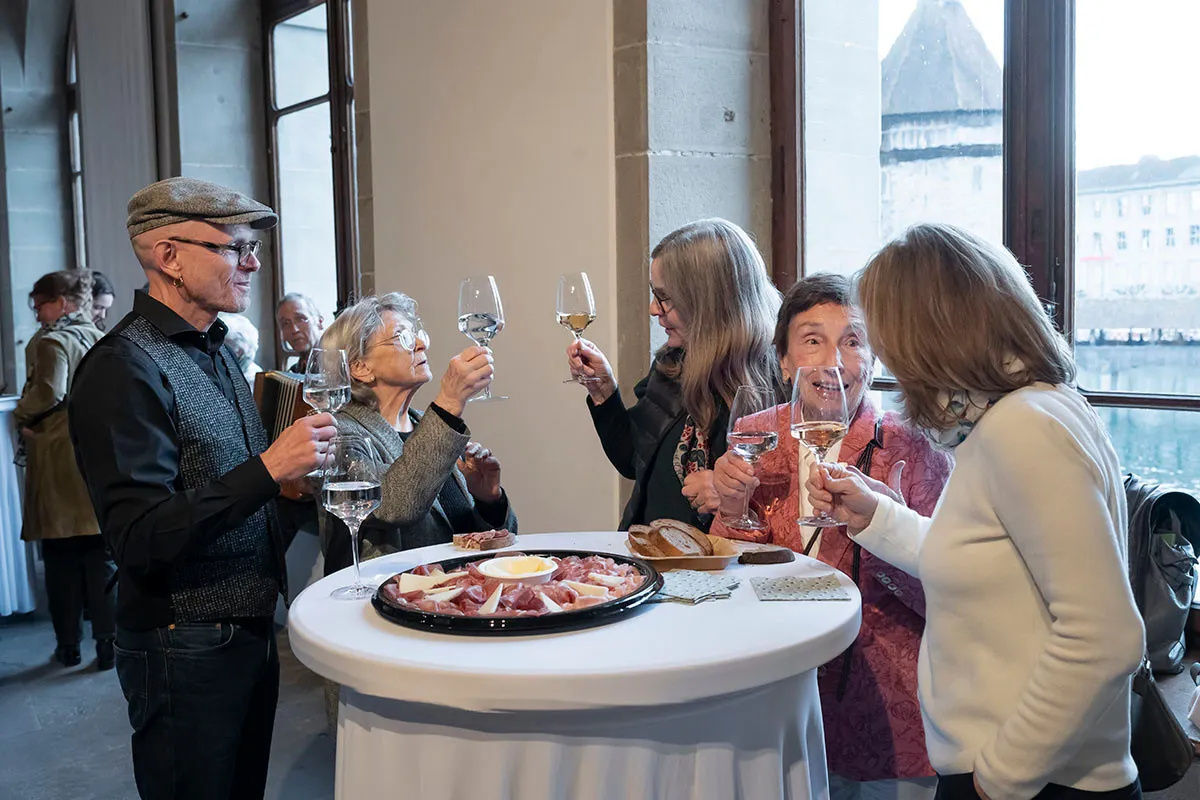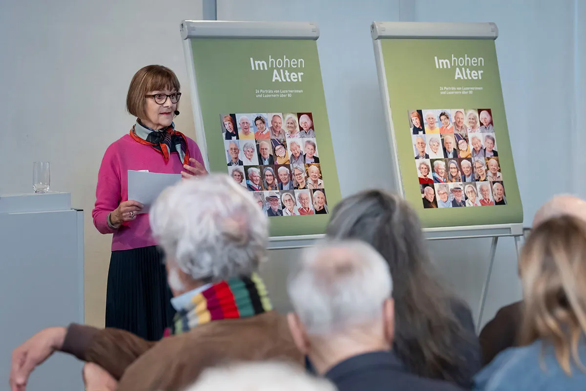 Die 24 in einem Buch und auf Plakaten porträtierten Luzernerinnen und Luzerner zwischen 82 und 97 Jahren trafen sich am Sonntag, 23. März 2025, in der Kornschütte Luzern zur Vernissage. Den Start der Sensibilisierungskampagne «Das hohe Alter» feierten mit ihnen Angehörige, Autor:innen und Promotor:innen des Forum-Luzern60plus-Projekts. Nach den Ansprachen, der Vorstellung der Porträtierten und der Verteilung des Buchs gings über zum festlichen Apéro.